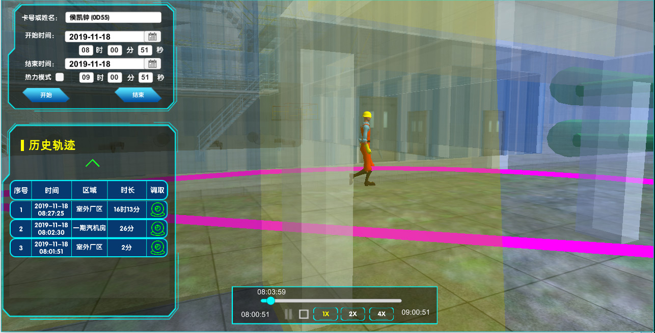 系統(tǒng)支持接入電廠視頻監(jiān)控系統(tǒng),在三維電子地圖上顯示視頻監(jiān)控位置,任意切換調(diào)取視頻監(jiān)控。可實(shí)現(xiàn)快速查找、單點(diǎn)回放、圖像識(shí)別等功能。同時(shí)可基于人員當(dāng)前位置自動(dòng)調(diào)取對(duì)應(yīng)的視頻監(jiān)控,對(duì)人員行走到其他位置自動(dòng)切換到相應(yīng)監(jiān)控畫面。對(duì)于發(fā)生異常的情況,可基于人員歷史軌跡不同位置及不同時(shí)段調(diào)取相應(yīng)位置相應(yīng)時(shí)間段的歷史視頻監(jiān)控,與歷史軌跡聯(lián)動(dòng)播放,方便事故分析及責(zé)任劃定。